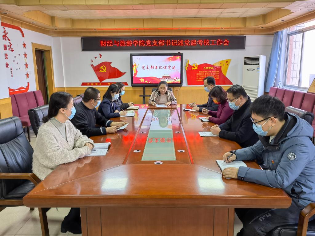 按照学校党委《关于2021年度党组织书记抓党建工作述职评议考核的通知》的安排,2022年1月14日下午,财经与旅游学院党总支召开党支部书记述党建考核工作会,会议采取线上线下相结合的方式,现场述职在格物楼408会议室举行,在校党总支委员、支部委员现场参会,其余未在校支部委员线上参会,党总支书记孙继龙主持会议。