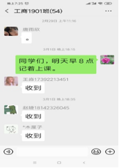 (2)考勤情况: 我使用翻转课堂手势签到,如下图1;以2月26日签到为例,有10名同学未签到,人数较多,我课后让学委进行了解原因报告给我,如上图2,对于网络问题,要求其他时间补上学习,对于忘记时间 ,我每次都在前一天晚上在微信群提前通知。
