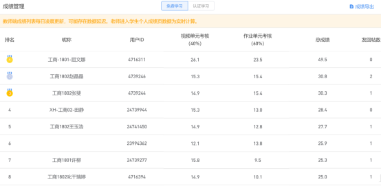 本系统无签到设置,可通过观看视频量化得分了解学生学习情况。前两周学习结束后,有五名学生未及时完成任务,通过通报批评、打电话传达教育等方式,学生均虚心接受并完成了学习任务。