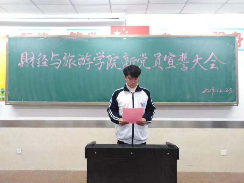 2019年12月25日下午,财经与旅游学院2019年新党员入党宣誓仪式在学院崇明楼806教室隆重举行。参加此次活动的有财经与旅游学院党总支书记孙继龙同志,总支组织委员仝丹娜同志以及学生第一党支部教师党员和部分学生党员,第53、54期入党积极分子,共70余人。