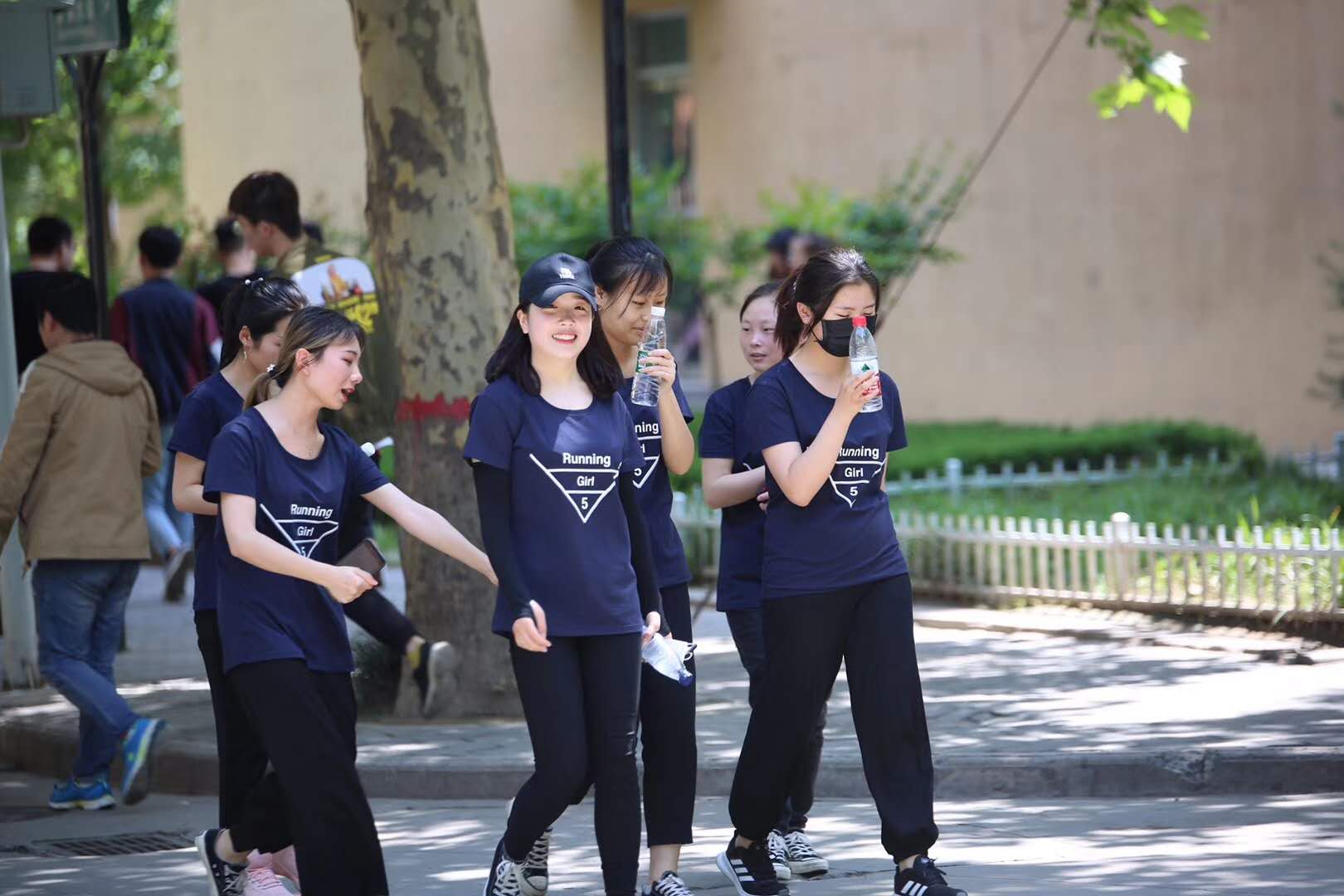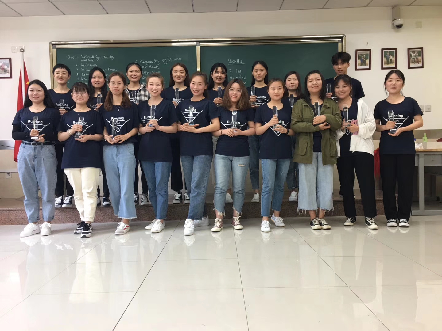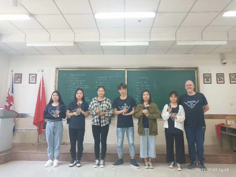 “Running Girl 5”活动于当天中午13:30开始,所有参加活动的学生身穿由John统一订制的蓝色T恤,聚集在精艺楼东门外广场,每六人一组,由组长随机抽取任务卡,按照卡片上的英文提示,不断奔跑在校园内诸多建筑标志及地理位置寻求答案。最先完成任务的前三组团队获胜。在经过三个小时紧张激烈的奔跑之后,来自商英1701班的郭美琪、商英1702班的党凯莉和商英1701班的高喜萌团队分别荣获一、二、三等奖,并由John亲自颁发奖杯及奖品。