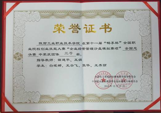 12月16日,第十一届全国职业院校创业技能大赛企业经营管理沙盘模拟赛项在成都落下帷幕,来自全国29个省市、125所高职院校的152支代表队参加了全国总决赛。经过8个多小时的激烈角逐,由工商管理学院工商1701班的白媛娜、王云飞、王秀丽和工商1702班的张华四名同学组成的参赛代表队获得团体三等奖。