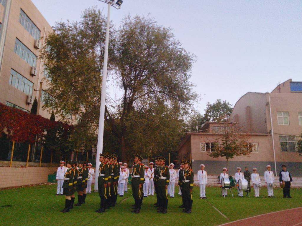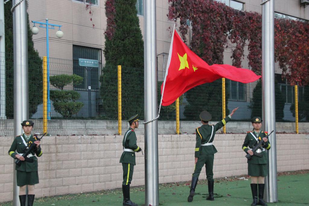 6时50分,升旗仪式正式开始。迎着初升的朝阳,国旗护卫队队员迈着铿锵的步伐护送五星红旗走向升旗台,伴随着庄严的国歌声,五星红旗冉冉升起,全体师生肃立,行注目礼。