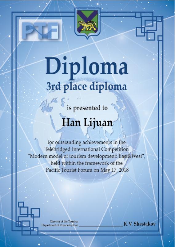 2017年5月17日,我院工商管理学院商务英语专业学生在商务英语教研室教师郑琳靖、John Smith以及旅游管理教研室的张娟飞老师的精心指导之下,首次参加俄罗斯远东联邦大学、海参崴州立大学经济与服务学院主办、普里莫尔斯市游客信息中心协助举行的太平洋地区国际旅游者论坛竞赛项目中获得三等奖。