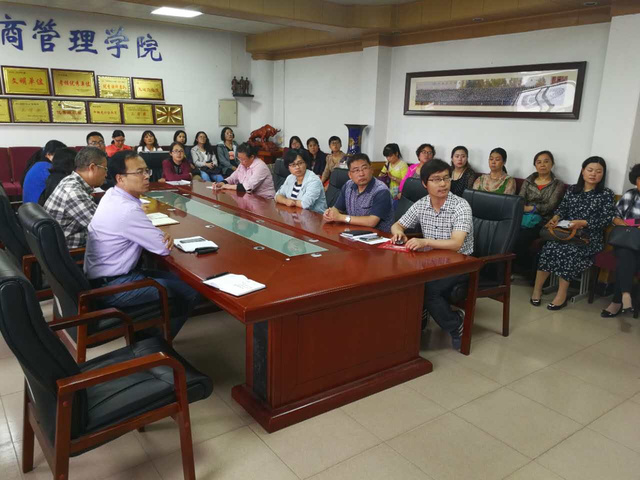 2017年6月5日下午,工商管理学院全体教职工在格物楼408会议室召开第三届互联网+创新创业大赛中期总结会。会议由韩文飞院长主持,实训中心主任张联朋对第三届互联网+创新创业大赛从启动到完成项目网上报名,大半年时间以来不同时期的工作情况进行了总结和通报。会议的主题是“总结、提高、继续加油!”