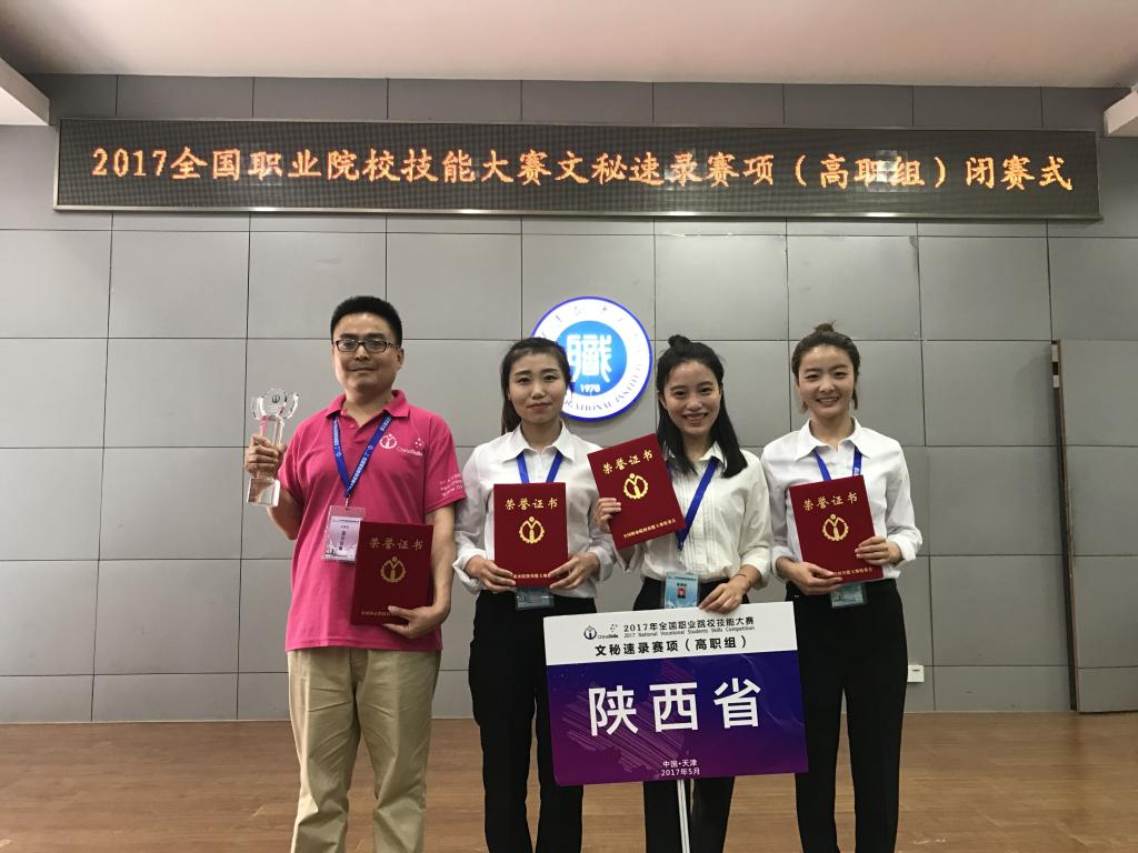 5月10日上午,由教育部主办的2017年全国职业院校技能大赛“亚伟杯”文秘速录专业技能赛项在天津职业大学落下帷幕。来自全国28个省市69所院校的207名学生,通过实时速录与文书整理、文字校对与文本速录、模拟办公管理、蒙目速录、办公室实务操作共5项竞赛内容的激烈角逐,决胜出团体一等奖7个、二等奖14个、三等奖21个。由我院工商管理学院文秘专业张洋、姚婷婷、李海艳3名同学组成的代表队脱颖而出,最终斩获团体一等奖,这也是继2016年我院代表陕西省首次获得此赛项团体一等奖后的又一飞跃式突破。来保卫、李晓红两位老师获得教育部优秀指导教师称号。