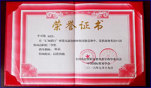在第九届全国外贸技能竞赛商务英语口语技能竞赛中,竞赛分为初赛、复赛和决赛三个阶段,根据选手来源分成中职组、高职组和本科组,同时竞赛,分开计算成绩。来自全国66所高职院校的66名选手同台竞技。各参赛选手都保持了良好状态,凭借着自己的实力,精彩展现,表现出良好的语言能力和综合素质。我院选送的工商管理学院商务英语1501班学生李可愉,在高职组的比赛中积极展示风采,争创佳绩;最终,荣获商务英语口语赛项高职组三等奖!