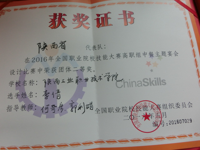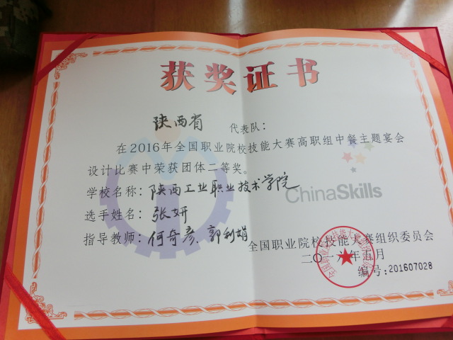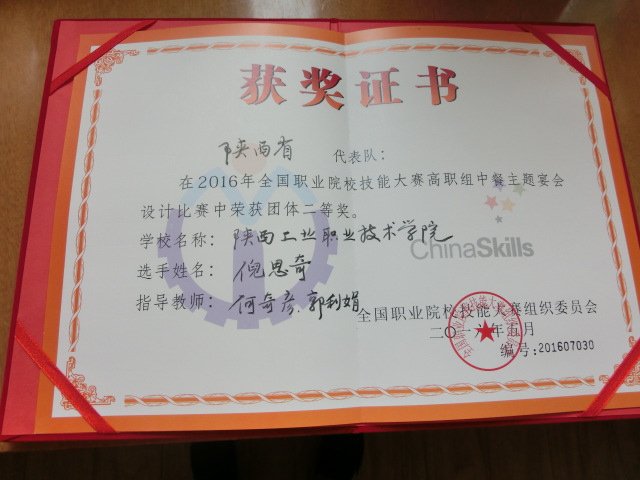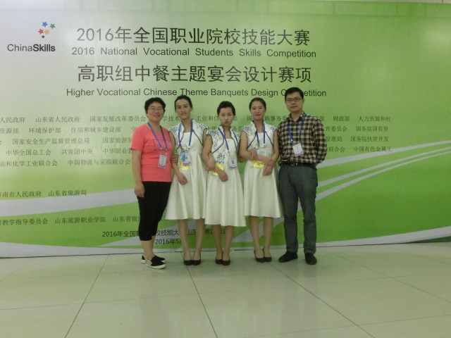 5月26日至28日,2016年全国职业院校技能大赛高职组“中餐主题宴会设计”赛项在山东旅游职业学院举行。来自全国30个省区市、57所院校的171名选手参加了比赛,参赛省份和人数创历史新高。我院以工商管理学院院长韩文飞为领队,何奇彦、郭利娟两位老师带领酒店管理14级张妍、李倩、倪思奇三位同学参加了比赛。经过激烈角逐,我院选手以总分第10名的成绩荣获大赛团体二等奖。