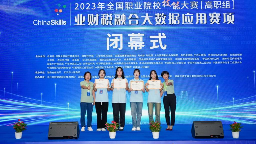 2023年7月22日至24日,2023年全国职业院校技能大赛(高职组)“财税融合大数据应用”赛项在长沙商贸旅游职业技术学院成功举办。本赛项为团体赛,全国31个省共95支队伍380人参赛,每队4人,是全国职业院校技能大赛大规模赛项之一。经过两天的激烈竞争,由我校财经与旅游学院杨红、常明明老师指导的大数据与会计专业秦宁宁、梁心茹、王菲茹、马艳红同学组成的代表队斩获团体三等奖,实现了该专业在学生技能大赛国赛零的突破。