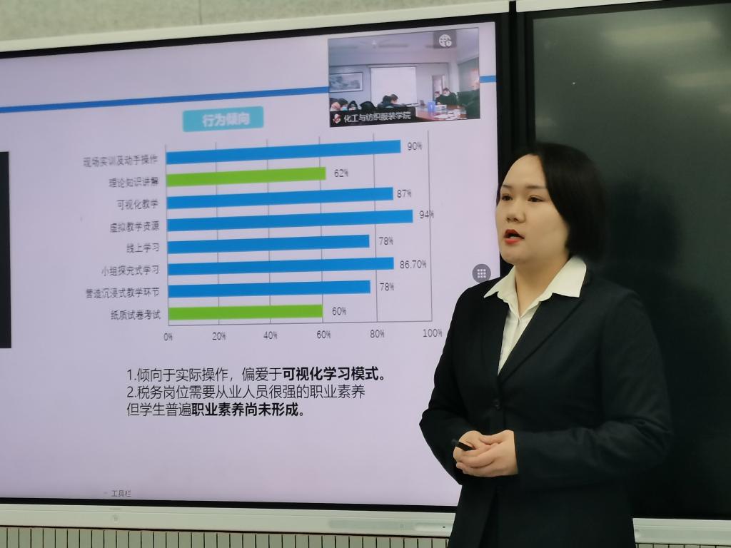 活动共分为2个环节。第一个环节由赵玉静、张路程和雒祎凡、李萍等4位老师分别对《基础会计》《智能化税费申报与管理》课程进行课程思政说课和教学展示。4位老师分别从2门课程的思政建设总体设计、教学实践、评价与成效以及特色与创新等七个方面和课程思政元素在课程实施过程中的挖掘、融入与呈现情况进行讲解和展示。