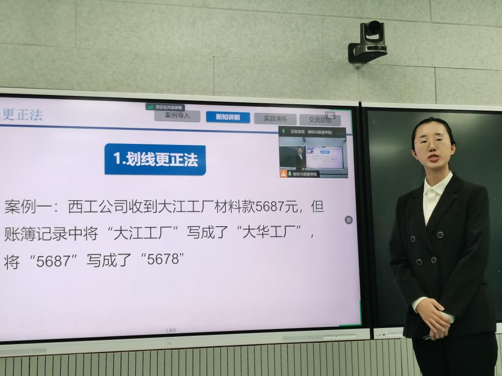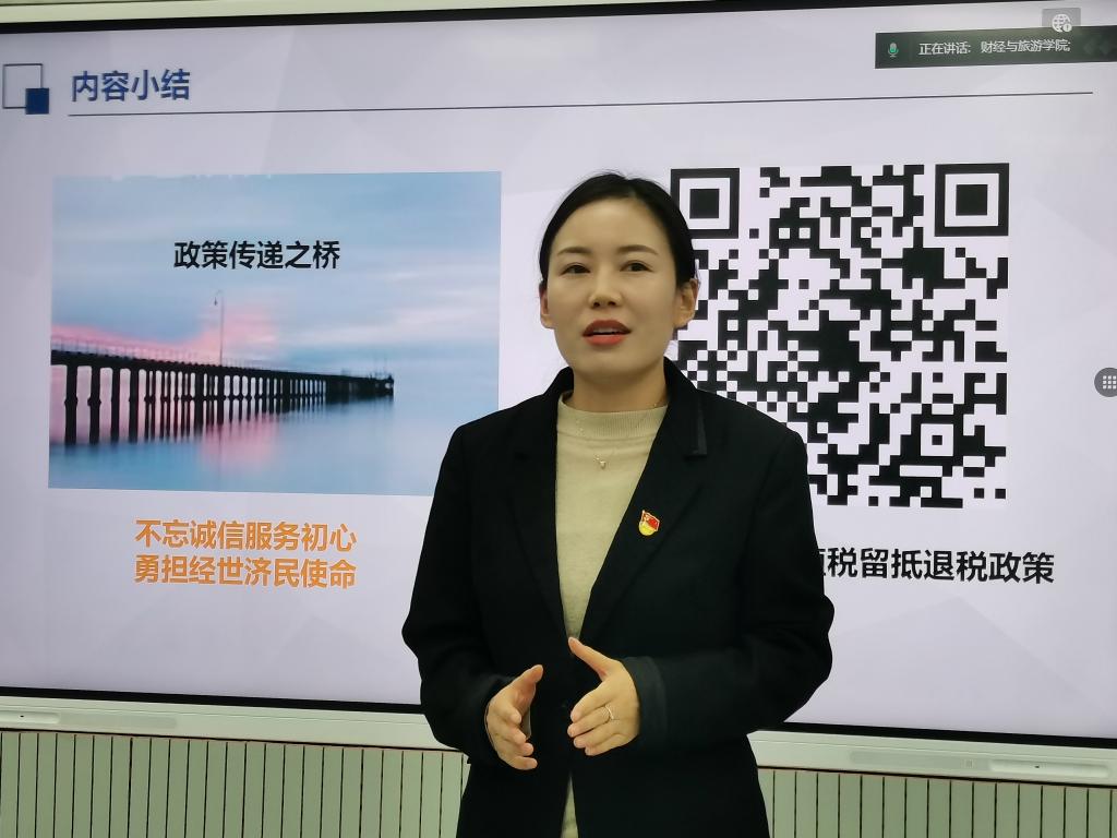活动共分为2个环节。第一个环节由赵玉静、张路程和雒祎凡、李萍等4位老师分别对《基础会计》《智能化税费申报与管理》课程进行课程思政说课和教学展示。4位老师分别从2门课程的思政建设总体设计、教学实践、评价与成效以及特色与创新等七个方面和课程思政元素在课程实施过程中的挖掘、融入与呈现情况进行讲解和展示。