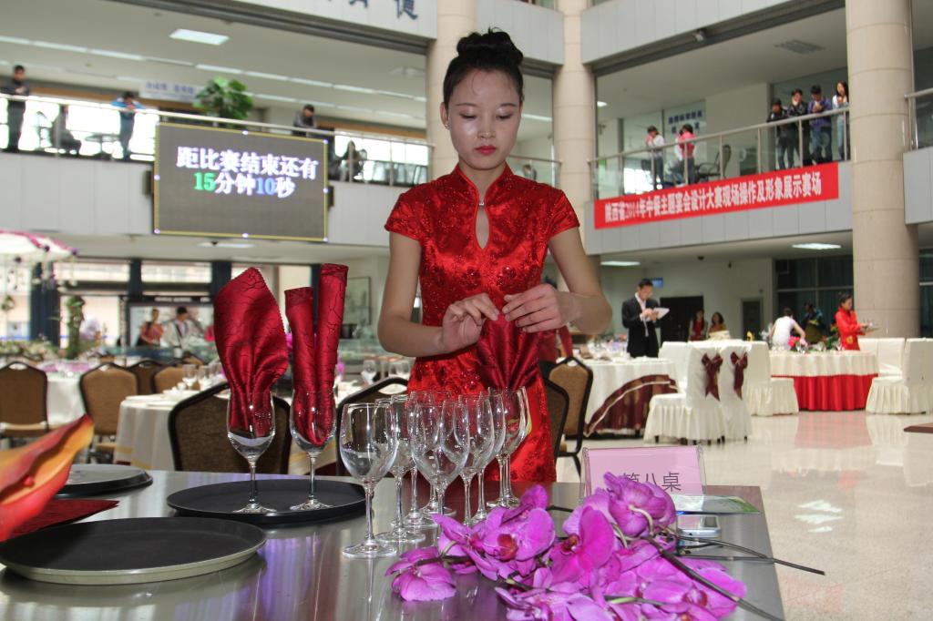 “中餐主题宴会设计”赛项,以餐饮业实际经营中主题宴会设计的标准和要求为主线,涵盖职业形象展示、台面创意设计、菜单设计、餐巾折花、中餐宴会摆台、斟酒、英语口语、专业理论、现场分析等内容。