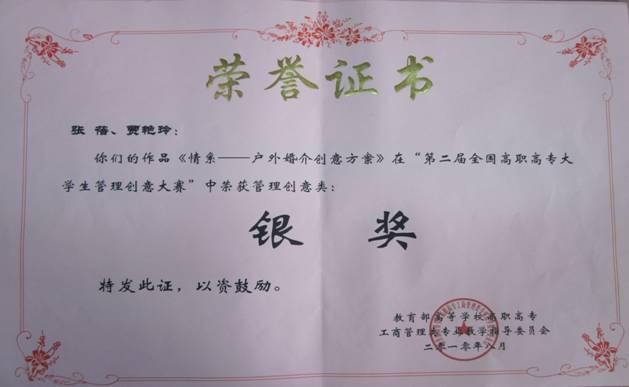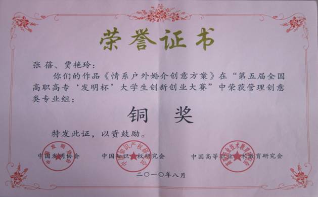 荣获中国发明协会、中国知识产权研究会、中国高等职业技术教育研究会颁发的“第五届全国高职高专‘发明杯’大学生创新创业大赛”管理类创意类专业组铜奖;同时荣获教育部高等学校高职高专工商管理类专业教学指导委员会办法的“第二届全国高职高专大学生管理创意大赛”管理创意类银奖。