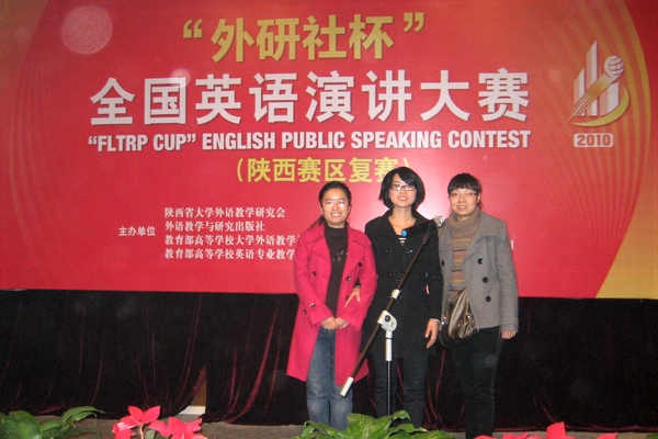 11月20日,2010年“外研社杯”全国英语演讲大赛——陕西赛区复赛在西安交通大学逸夫科学馆国际会议中心举行,我院商务英语专业0903班学生吝萌在比赛中表现出色,荣获三等奖。本次大赛于今年5月启动,由教育部高等学校大学外语教学指导委员会、教育部高等学校英语专业教学指导分委会和外语教学与研究出版社主办,西安交通大学承办。比赛经过层层选拔,共有44名选手入围陕西赛区复赛。比赛中,我院吝萌同学在和众多研究生、本科生同台竞技中,不畏强手,沉着冷静,经过定题演讲和即兴演讲两个环节的激烈比拼,最终荣获三等奖,为学院争得了荣誉。