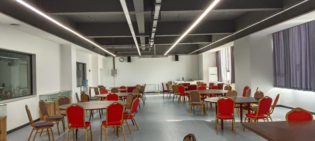 中西餐宴会实训室建成于2022年8月,使用面积228平方米,学生实训工位数100个,仪器设备及软件资产总额10万余元。主要仪器设备及软件有多媒体教学设备1套,音箱设备1套,投影仪和扩音设备,中餐桌8套、西餐桌4套、宴会椅90余张、实物陈列柜6台,储物柜6个,同时还配有多套中、西餐餐具供学生训练使用。实训室配有前厅、客房、餐饮操作以及酒店管理等课程软件和实训平台。