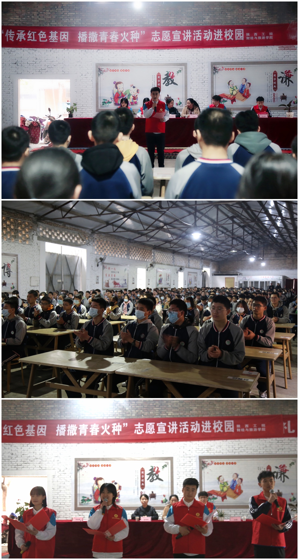 为进一步倡导和树立“奉献、友爱、互助、进步”的新时代志愿服务精神,以实际行动积极响应校团委关于2021年“学雷锋志愿服务月”活动的要求,3月26日上午,财经与旅游学院“寻根梁家河,实地悟初心”社会实践团队2名指导老师与6名学生成员组成志愿者团队,前往咸阳市百灵中学高新校区,开展主题为“传承红色基因,播撒青春火种”的志愿宣讲活动。出席本次活动的有百灵中学高新校区校长助理马广谋,德育主任孟永发,还有师生代表共600余人。