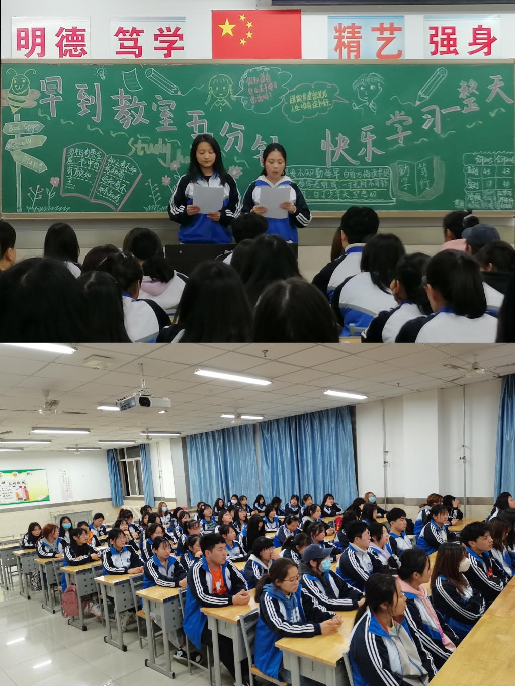 为进一步加强我院学风建设,引导学生端正学习态度,明确学习目的,使学生树立热爱学习、学会学习、善于学习的观念,促进学风的进一步好转,3月17日晚自习期间,财经学院2019级、2020级各班开展了“早到教室五分钟,快乐学习一整天”的主题班会教育活动。