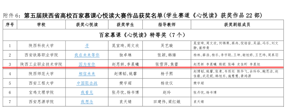 近日,第五届陕西省高校心理育人百家慕课学生作品展评落下帷幕,由学工部心理咨询中心推荐的财经与旅游学院学生张峰、赵思妍等六名同学参演的“心悦读”作品《因为有你》荣获第五届陕西省高校心理育人百家慕课心悦读特等奖,张雪萍老师获得优秀指导教师奖。