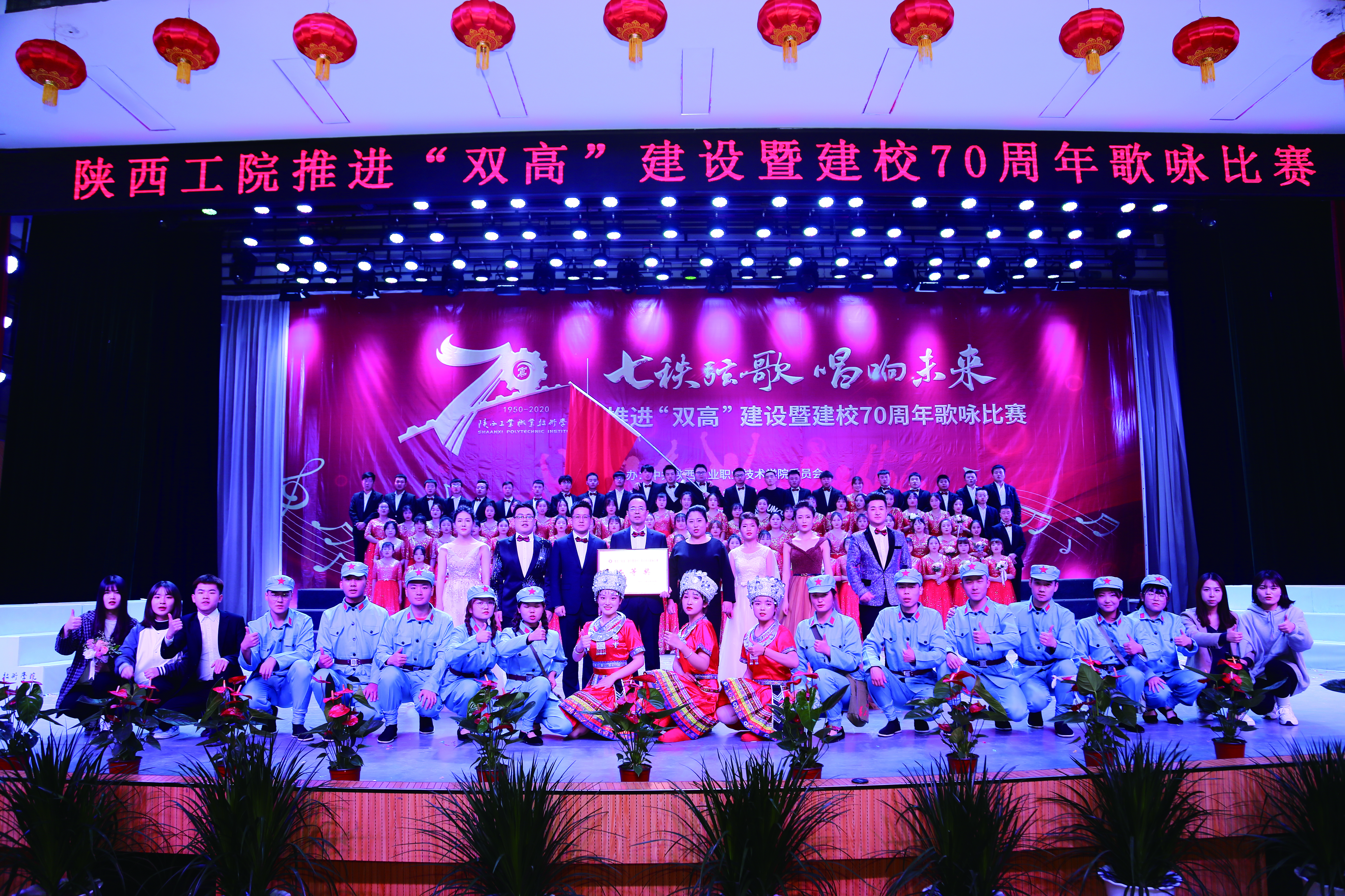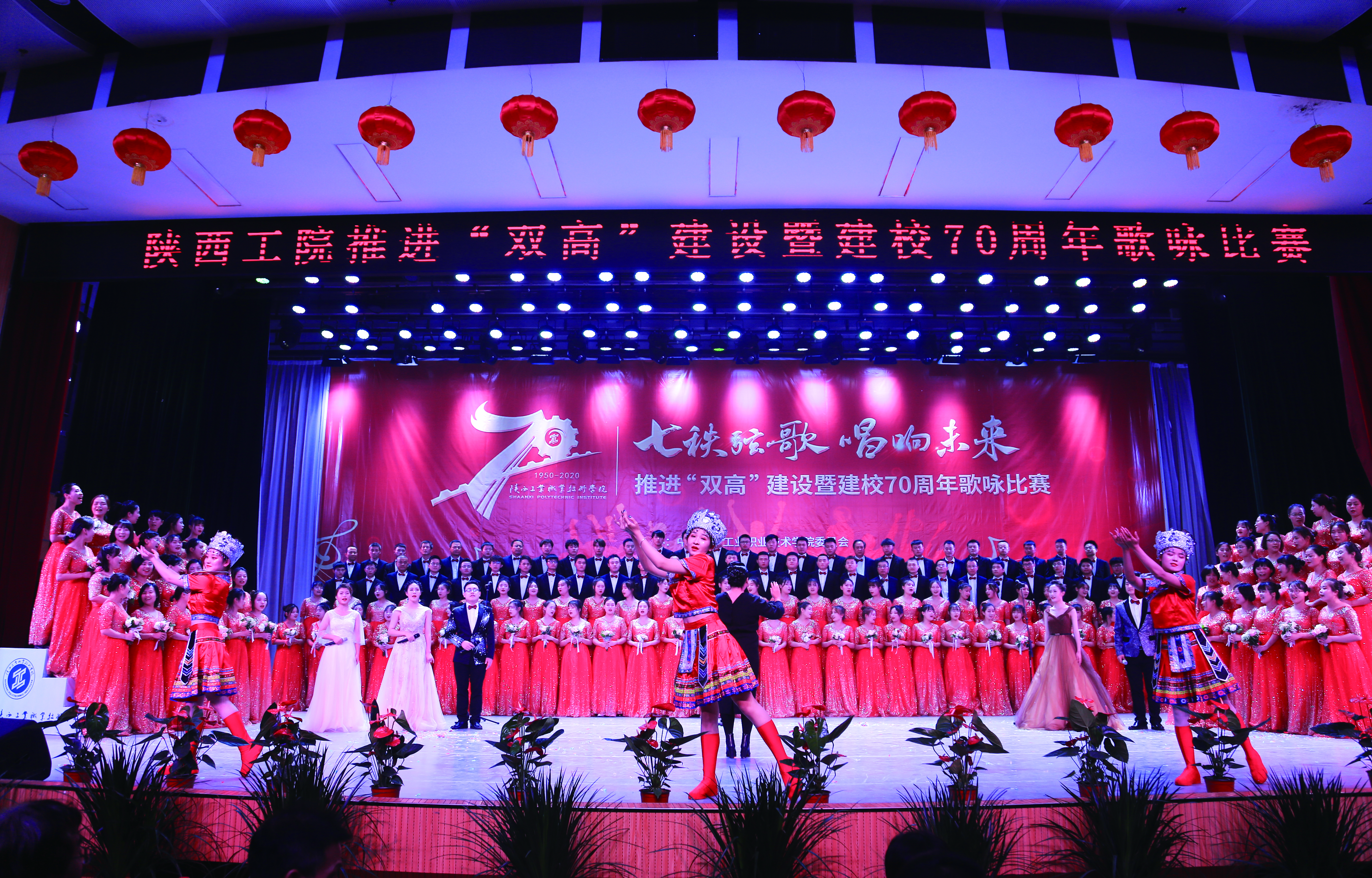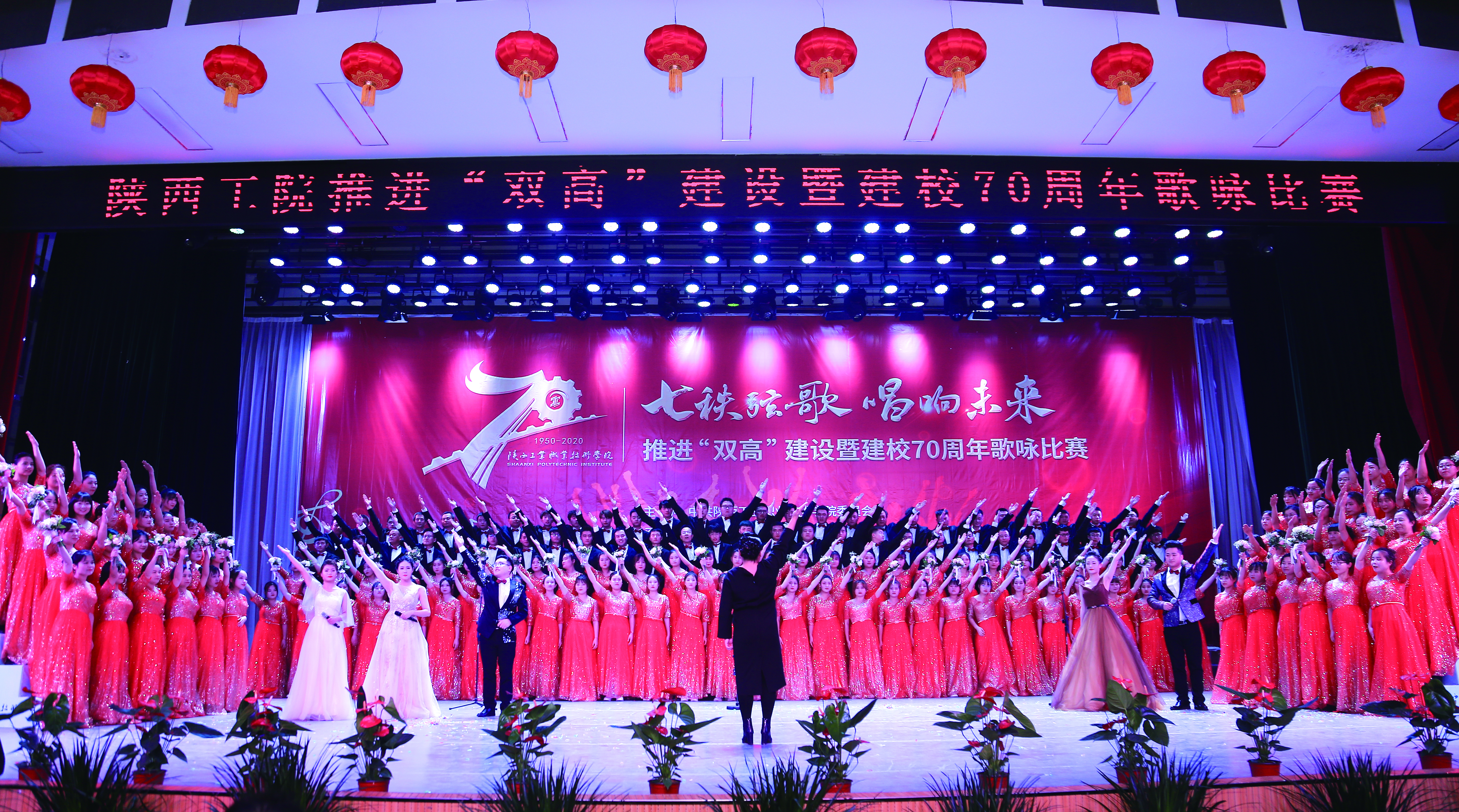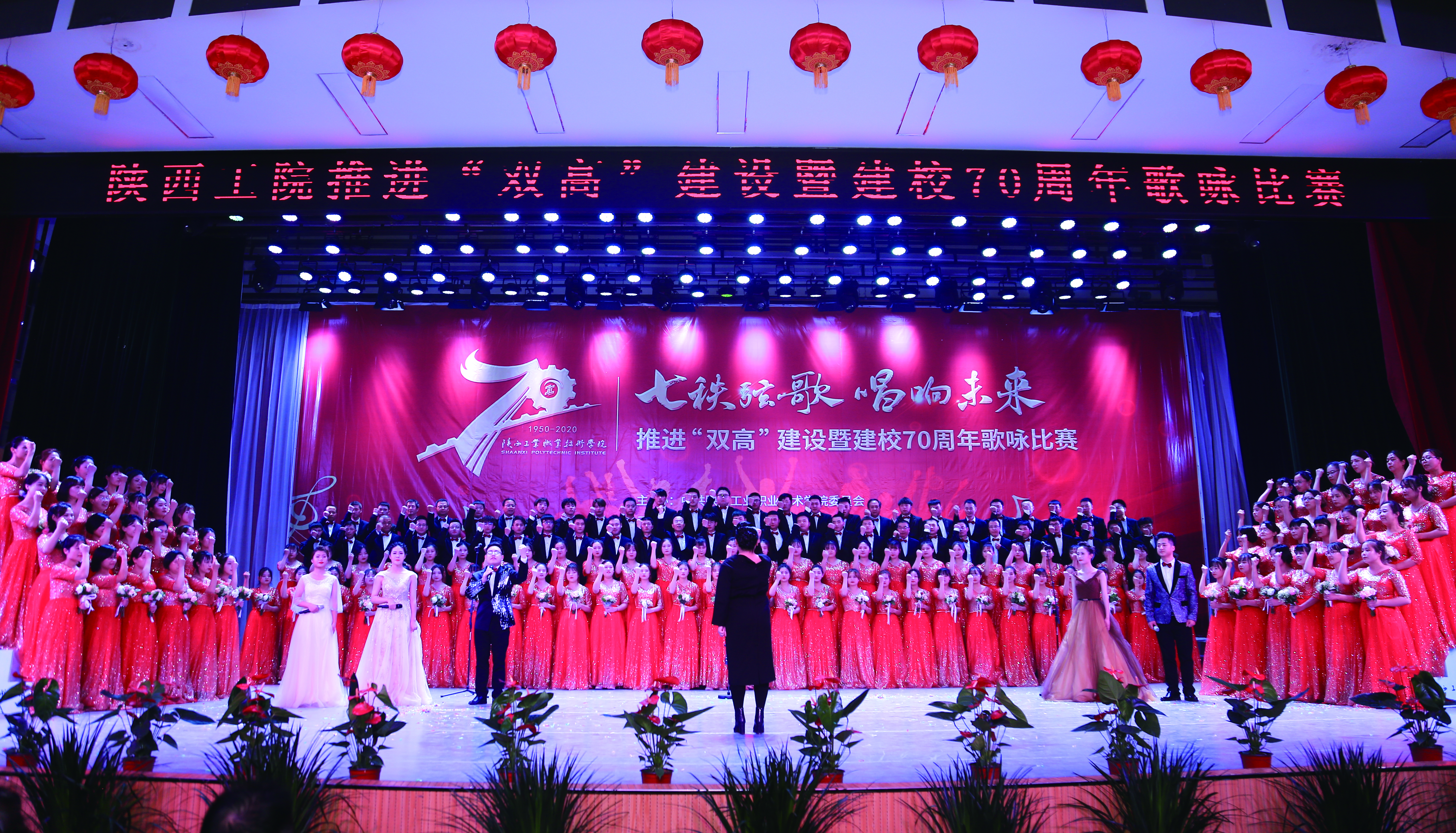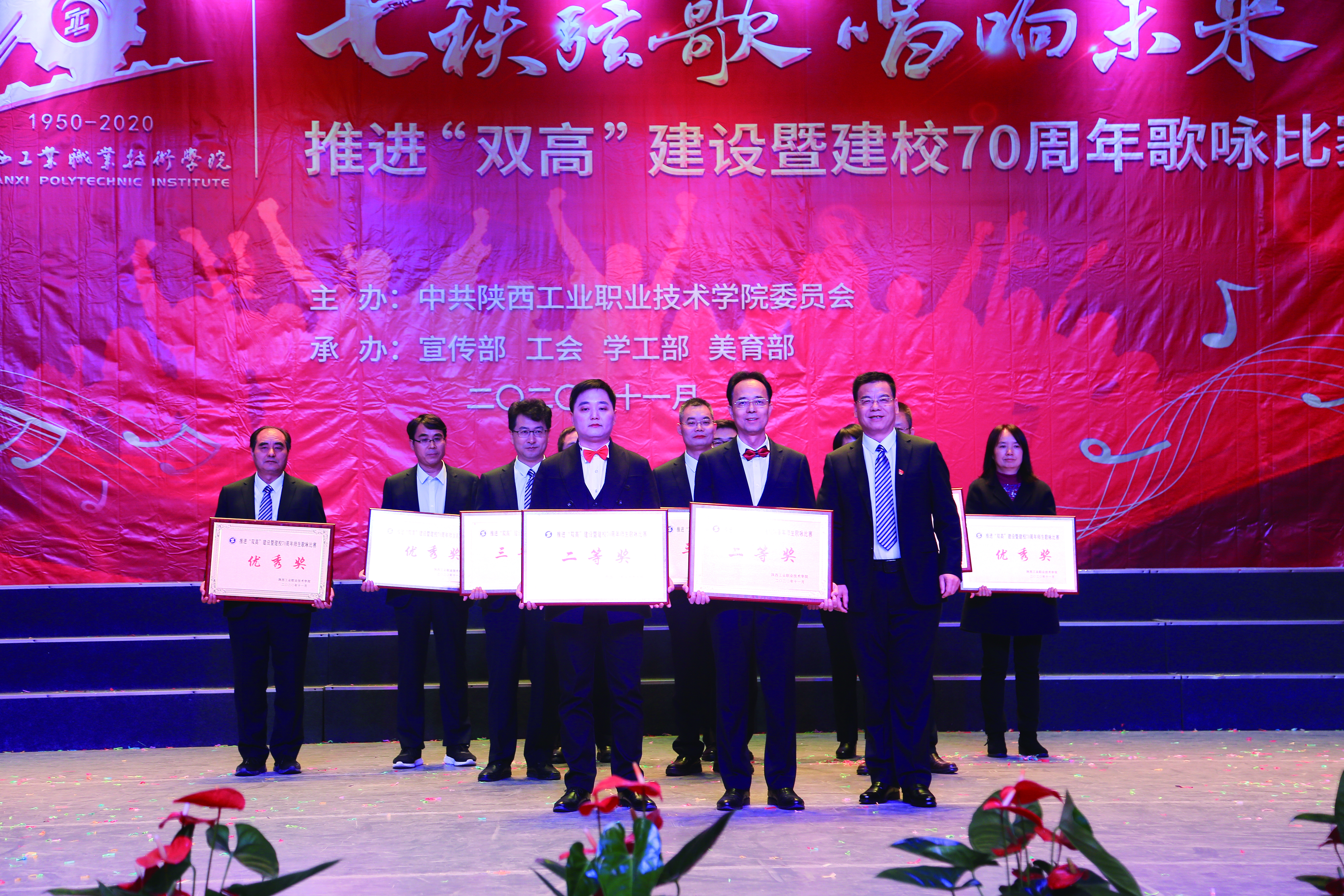 大合唱活动自启动以来,我院师生积极参与,利用课余时间精心排练,以饱满的热情投入到本次大合唱比赛的训练当中。大家从不熟悉歌曲到牢记每一句歌词都付出了大量的时间、精力,同学们一遍遍练习,认真的神情感染着每一个人。一场精彩的演出,从一次次排练到完美呈现,是所有台前幕后师生努力的共同结果。经过一个月的辛苦排练,师生们带着自信,手捧鲜花,精神饱满地登上了舞台。比赛中,大家深情的演绎了《陕西工院校歌》及《四渡赤水出奇兵》。璀璨的灯光下,一张张朝气蓬勃的面孔,激情嘹亮的歌声,气势磅礴的唱法,震撼了现场的每一位观众,赢得了现场阵阵掌声,将活动现场推向高潮。
