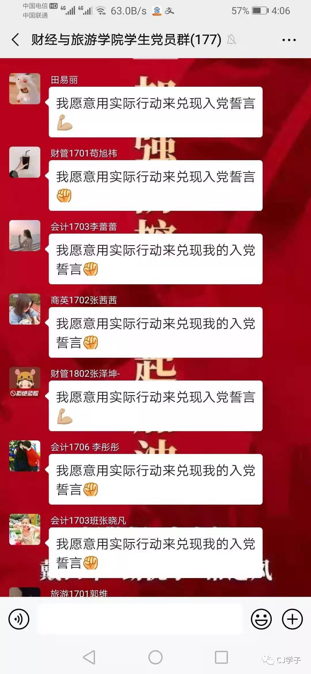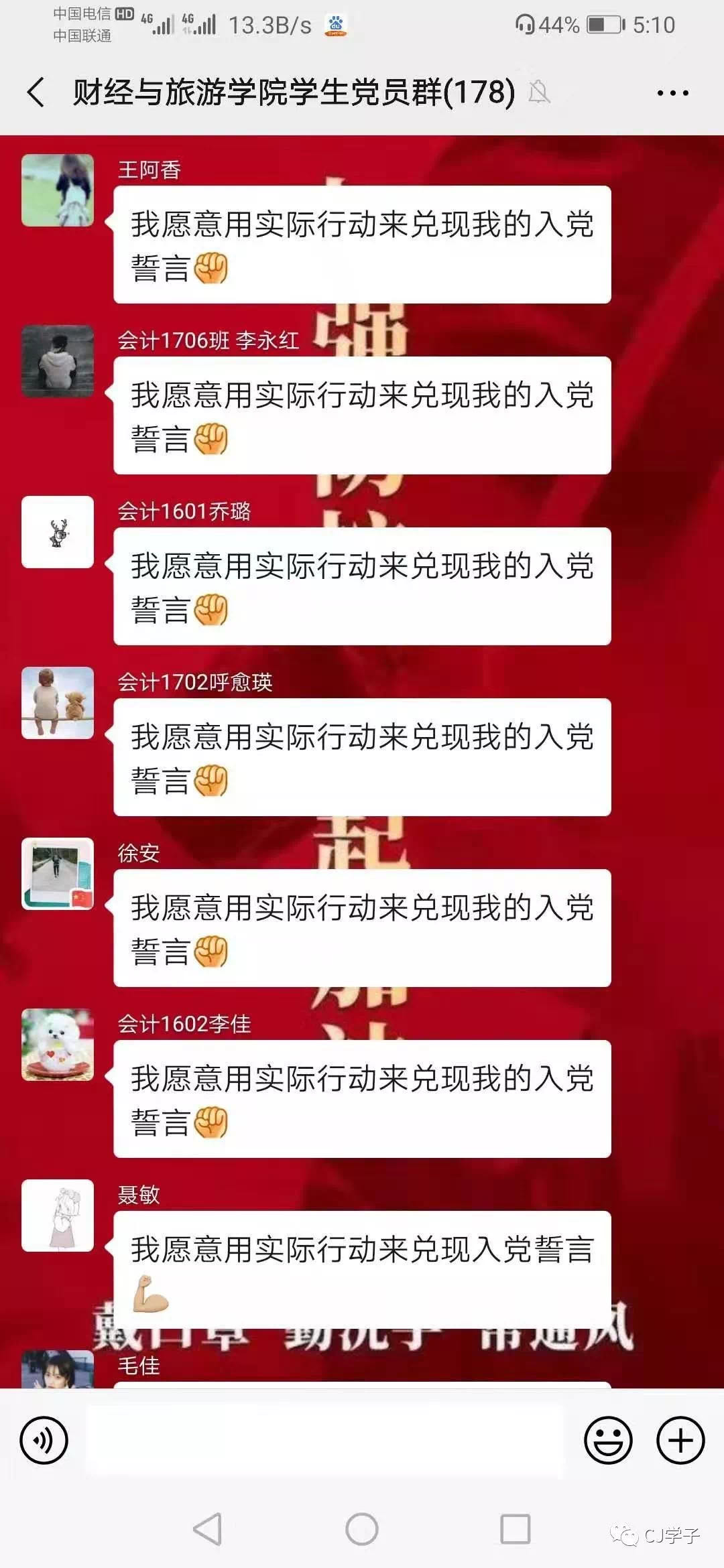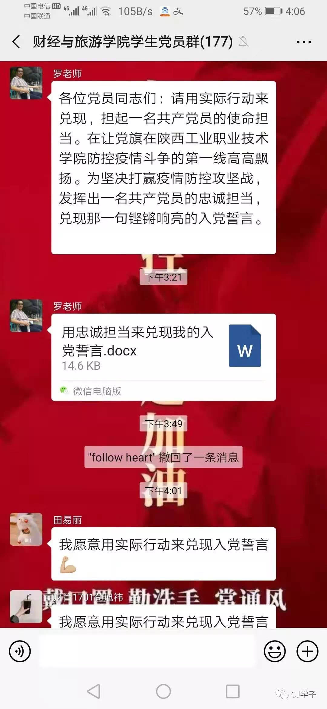 疫情防控是一场没有硝烟的战争,财经与旅游学院学生第一党支部的党员同志们,已充分认识到新型冠状病毒感染的肺炎疫情防控工作的复杂性、严峻性,保证能将思想统一到中省决策部署上来,高度重视疫情防控工作,积极理解配合学院所做的一切防控措施,珍爱校园、珍爱健康、珍爱生命,在加强自我防护的同时,愿意积极参与到疫情防控工作中来,发扬无私无畏精神,关键时刻愿意挺身而出,随时根据学院疫情防控工作需要,冲在前列,干在实处,真正做到哪里最危险、哪里群众最需要,哪里就有党组织和党员,用党组织和党员的付出换来万家团圆和幸福安康,用实际行动接受政治考验和党性检验。