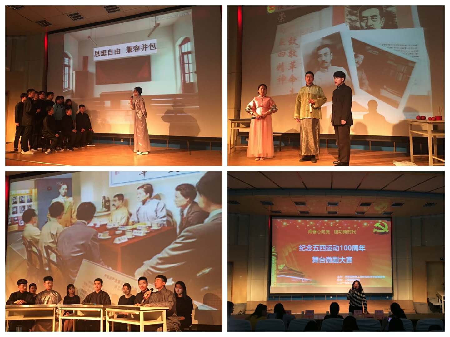 本次比赛中各二级学院以五四时期的代表人物为原型,用舞台微剧的形式展现“中国故事”,以此缅怀五四先驱崇高的爱国情怀和革命精神。比赛中学生们深情演绎了李大钊、蔡元培、胡适、蔡和森等一批五四人物,同学们在剧中重温了我党波澜壮阔的革命史,同时也经历了一场红色的洗礼,精彩的表演获得现场阵阵掌声。比赛之后,艺术中心袁夏莹老师进行了详细的点评,并结合《习近平在纪念五四运动100周年大会上的讲话》精神,充分肯定了本次活动的重要意义,她鼓励同学们珍惜青年时光,树立远大理想,以实现中华民族伟大复兴为己任,让青春焕发出更加绚丽的光彩。