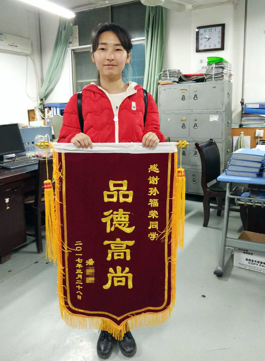 近日,一位潘姓女士来到工商管理学院学工办,非要给会计1402班的孙福荣同学送锦旗,并特别要感谢学院培养出这样一名优秀学生。