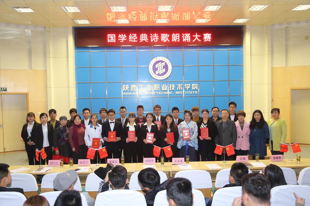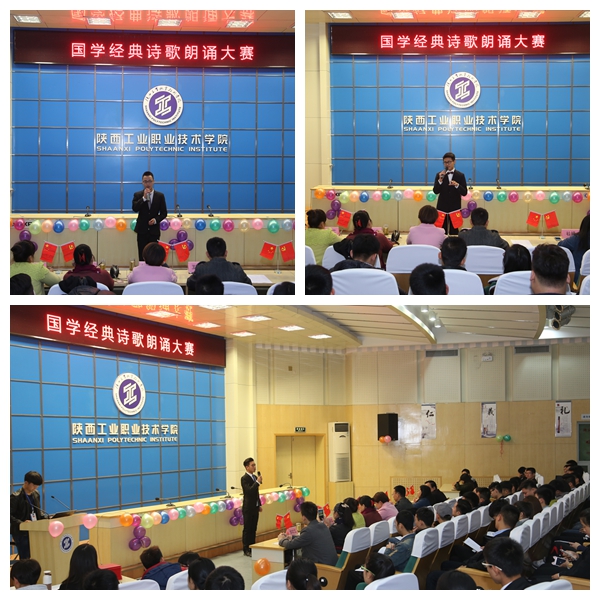为了弘扬和传承中华民族传统文化,激发学生学习国学经典诗文的兴趣,11月8日下午陕西工院第十四届艺术节“诵读国学经典,传承传统文化”国学经典诵读大赛决赛,在学术会堂举行,本次大赛甴院宣传部主办,院团委承办,工商管理学院协办,工商管理学院学工办主任杜娟、各二级学院学生会干部及各学院近400名师生参加了本次活动,院工会王金省、宣传部钟晓书、艺术中心袁夏莹、团委徐翠萍、工商学院郭晓莹老师应邀担任评委。
