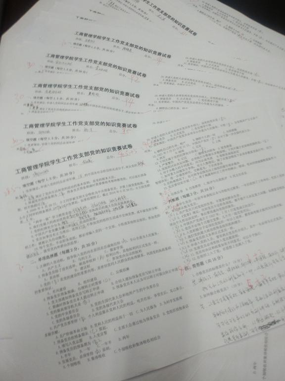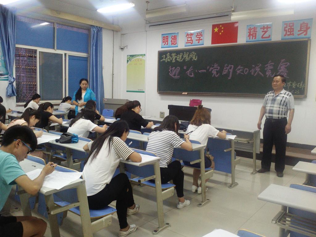 为迎接党的95岁生日,进一步增强学生党员对党建知识的学习热情,工商学院学工党支部“两学一做”学习教育系列之“迎七.一党的知识竞赛”活动,于6月23日晚七点半在学院崇文楼南C401/402教室开赛。学工党支部58名学生党员参赛,支部书记杜娟,支部委员罗峰、狄莹莹和侯建朝四位老师参与监考评卷。
