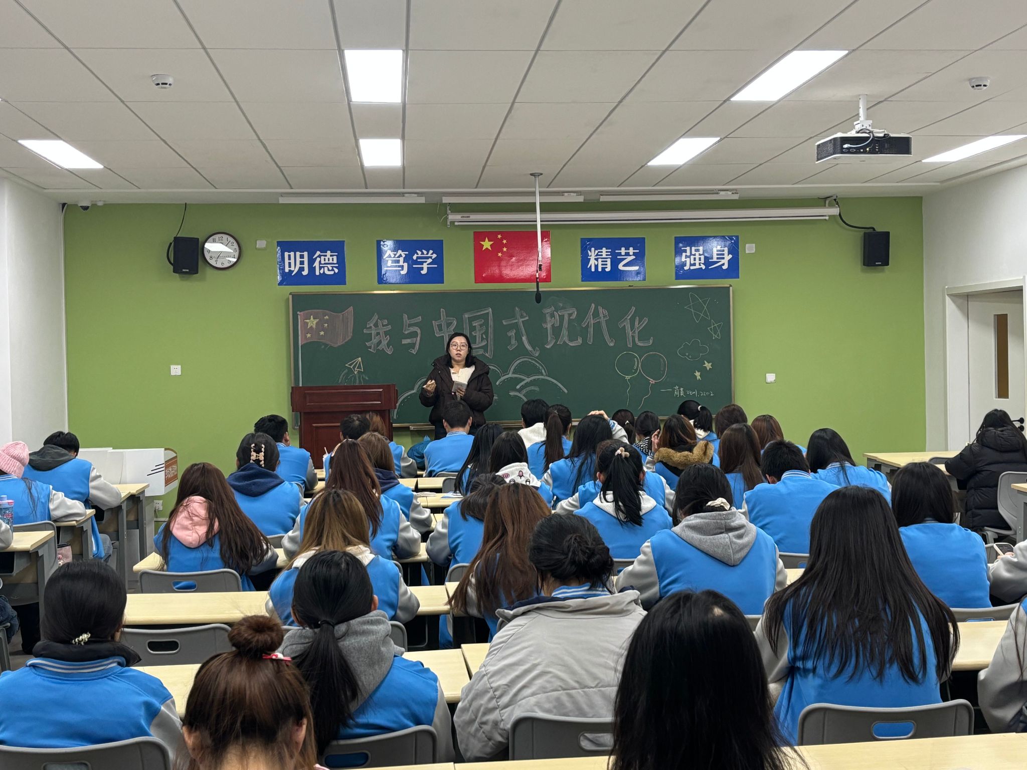 班会伊始,各班在班主任的带领下,系统学习了《党的二十大报告》中关于“中国式现代化”的系列重要论述及相关权威解读文章。通过对“人口规模巨大的现代化”“全体人民共同富裕的现代化”等核心特征的深入研读,同学们对中国式现代化的中国特色、本质要求和战略部署有了更清晰的认知,为后续讨论奠定了坚实的理论基础。