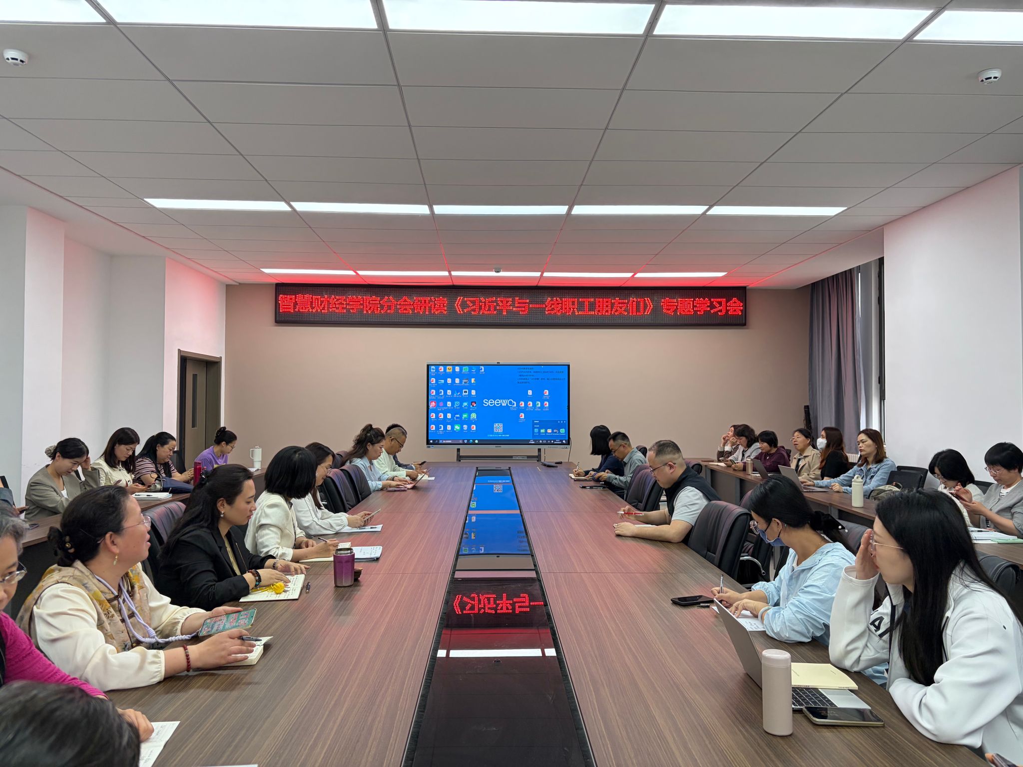 为深入贯彻落实校工会《关于认真组织学习〈习近平与一线职工朋友们〉的通知》精神,切实把思想和行动统一到党中央要求上来,4月27日下午,智慧财经学院分会在崇理楼D509召开研读《习近平与一线职工朋友们》专题学习会。学习会由分会主席张海峰主持,全体教职工会员参加了学习。